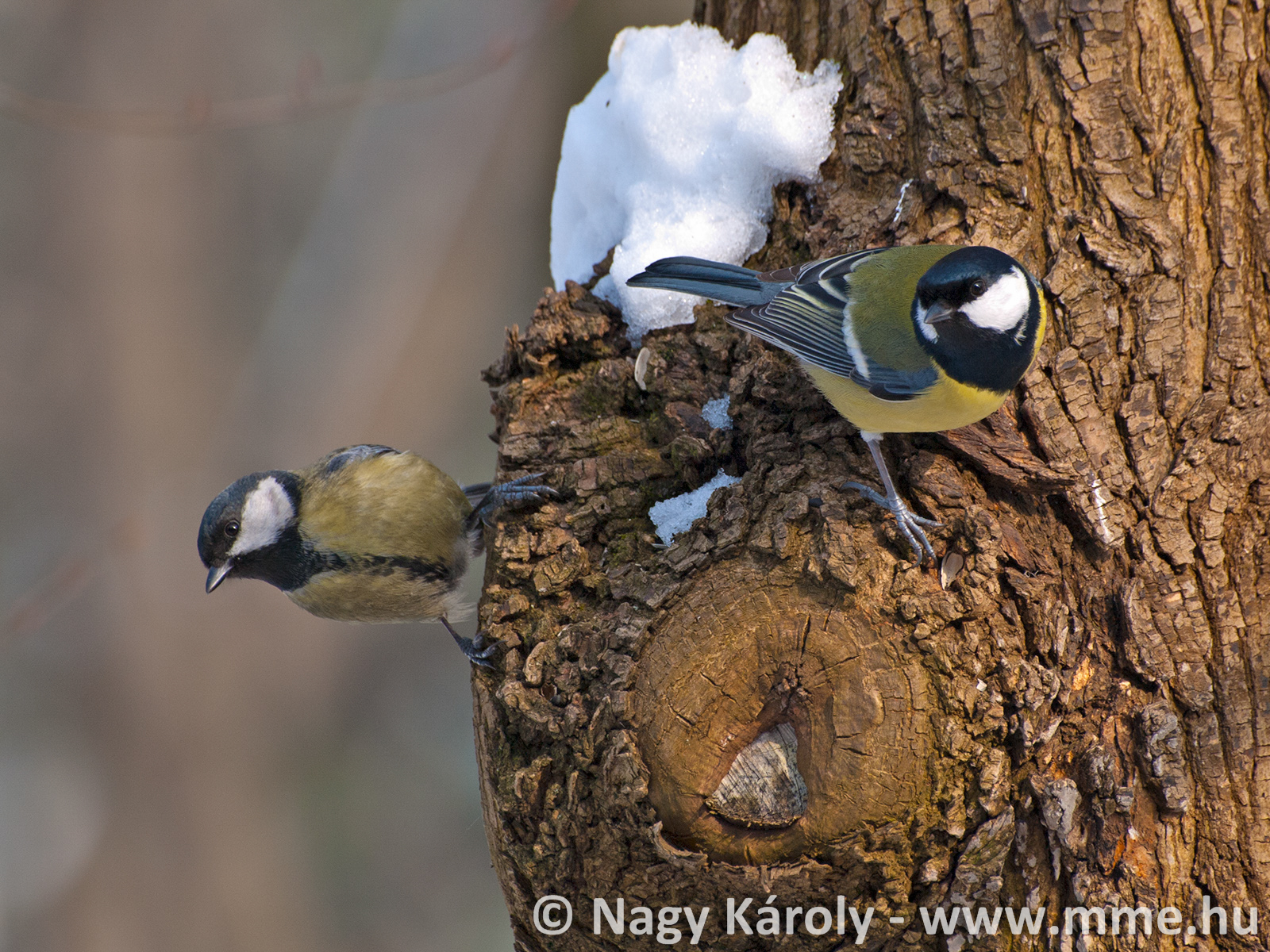 Csuszkák kéregraktárát fosztogató széncinegék (Videó: Orbán Zoltán).