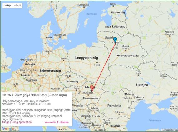 Litván gyűrűs fekete gólya megkerülési térképe (Tringa)