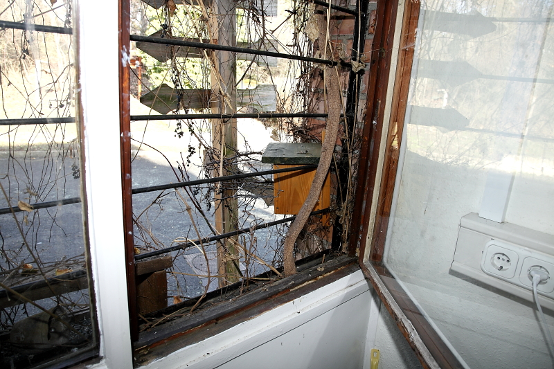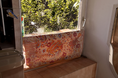 Galéria: Üveg hátfalú ablakodú egy befelé nyíló ablak alsó sarkába kihelyezve és a kartonpapíros illetve függönyös takarása.