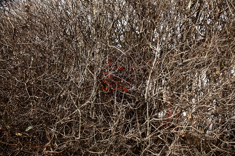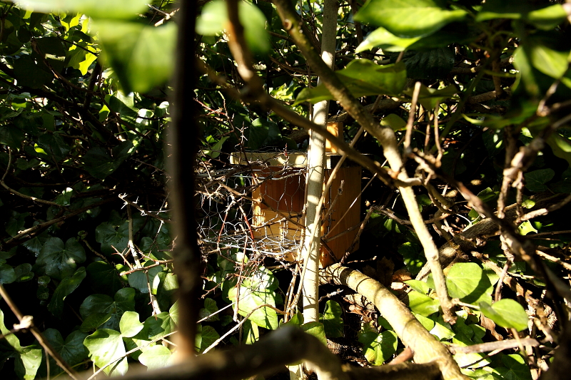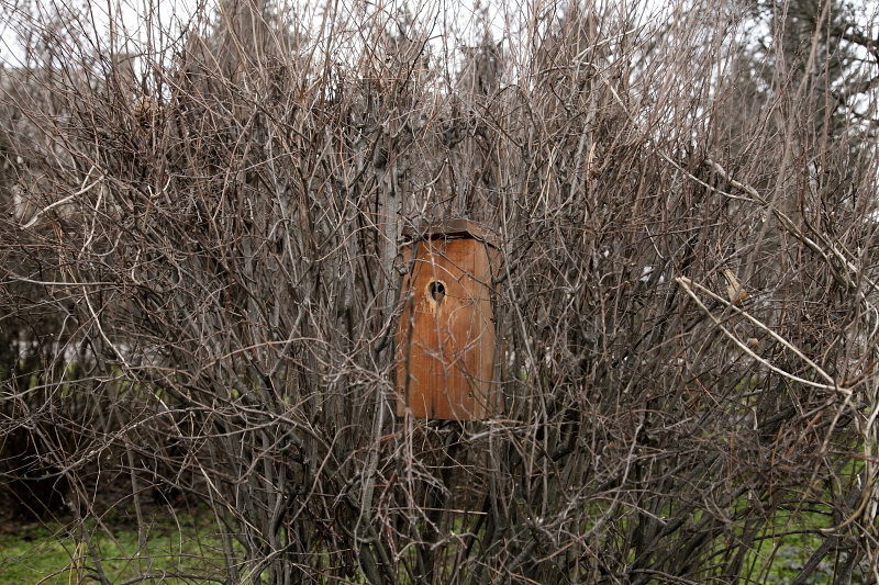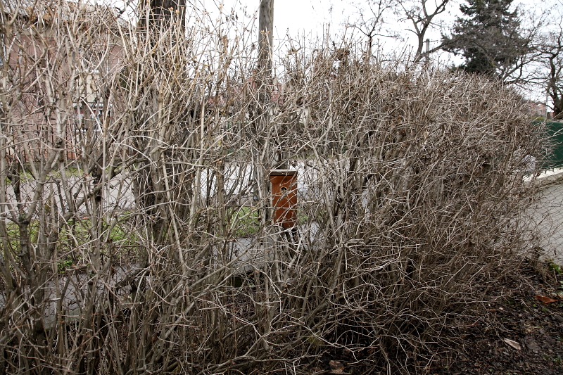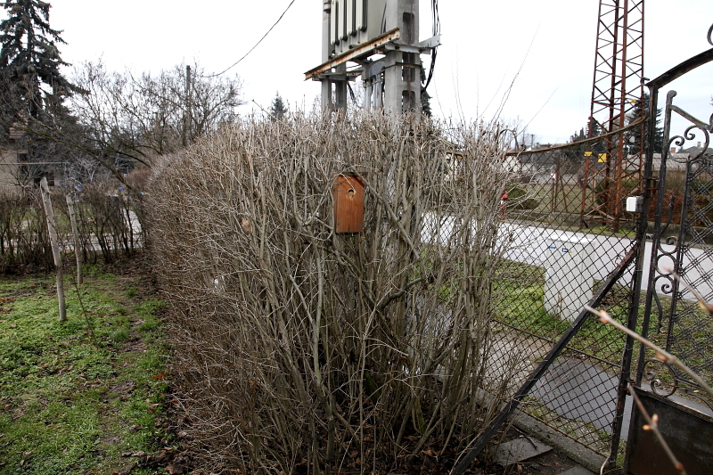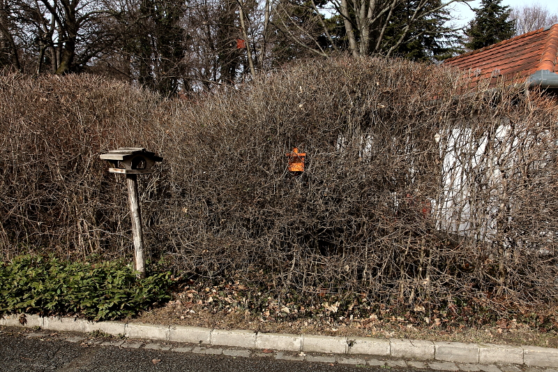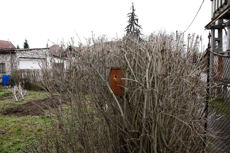 Pedig a macskák és a szárnyas ragadozók jelentette veszély a fiatalok kirepülését követően jelentősen csökken, mivel a bujkáló életmódot folytató vörösbegy és ökörszem fészket elhagyó fiókái számára a fészkelésre egyébként nem alkalmas bokrok már kellő védelmet nyújthatnak. Ezért ha valahogy meg tudnánk oldani, hogy a fészkek biztonságban legyenek, akkor jó eséllyel a jelenleginél nagyobb számban költhetnének ezek a madarak is a közelünkben – újabb megfigyelési élményekkel gazdagítva életünket. Szerencsére ehhez rendelkezésünkre áll egy olyan mesterségesodú-típus, ami térd- és derékmagasság közé kihelyezve, némi kiegészítéssel ennek a két fajnak a költését is segítheti. felnyírt, nem kellően széles bokrok, bokrosok nem alkalmasak a madarak,különösen a talajközelben költő fajok fészeképítésére (Fotó: Orbán Zoltán).