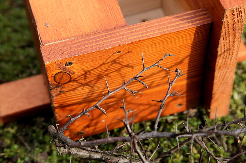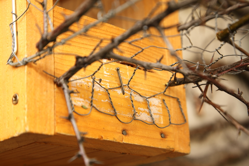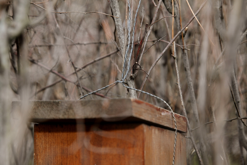 Az odúkat elvileg tüskés, tövises növényzetbe is kitehetjük, ilyenkor nincs szükség az alábbiakban leírtakra, de akinek már volt dolga ilyen cserjével, az tudja, hogy ezekről egy-egy ágat levágni sem egyszerű, nemhogy az ágak sűrűjébe karnyi mélységbe nyúlva hosszasan matatni. Ezért jobb, ha „békésebb” bokrot választunk és az alábbi megoldások valamelyikét alkalmazzuk.