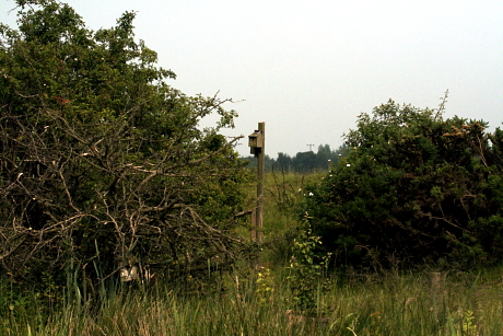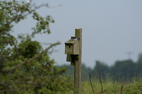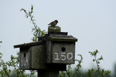 Mezei verebek számára csoportosan telepített "B" típusú madárodúk fátlan tóparti környezetben, Angliában, ahol a faj majdnem teljesen kipusztult.