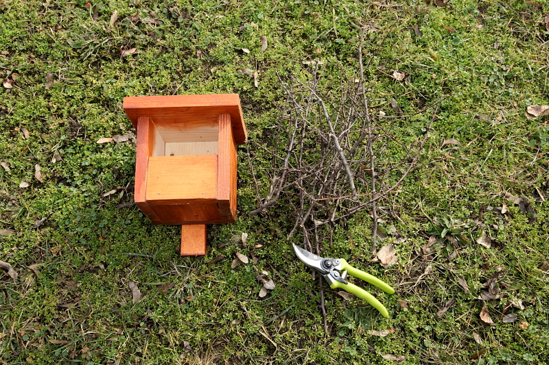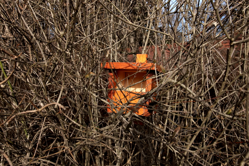 Az első, az odúk ellenőrzését és takarítását kevésbé támogató (ezért kevéssé ajánlott) módszer olyan bokrokban, sövényekben alkalmazható, ahol az odú a cserje belsejébe helyezhető ki úgy, hogy a sűrű ágak a bejárati oldalt is legalább jó arasznyi mélységben takarják.