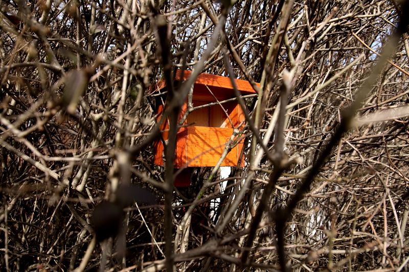 Ha nincs fa a közelben vagy csak sűríteni szeretnénk kertünk odúkészletét, a bokrokba és sövényekbe nyugodtan kihelyezhetünk „B” odúkat is. Ezeket a „C” odúknál magasabbra, inkább mell- és fejmagasságba tegyük ki, így jó eséllyel számíthatunk széncingék és verebek beköltözésére. Természetesen a „B” odúkat nem kell háló vagy töviseság-előtéttel védenünk, elég, ha az odú tetejét a hagyományos kihelyezésnél megszokott módon az odú testéhez drótozzuk.