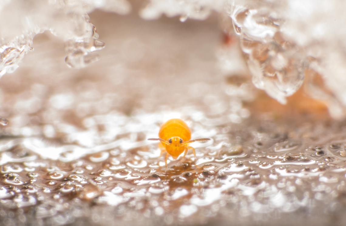 Az erdő fagyos talaján sem áll meg az élet: milliónyi, szabad szemmel nehezen megfigyelhető parány ilyenkor is munkálkodik a szerves anyagok lebontásán. Megfelelő felszereléssel, kitartással és ügyességgel láthatóvá válik a jégkristályok e csodálatos világa is. Ez az alig milliméter nagyságú aranysárga gömböc az ugróvillások (Collembola) közé tartozik.