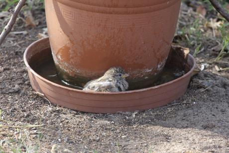 | Kánikulában a kertbe kitett szobanövény cserép alátétjében fürdő házi veréb. |