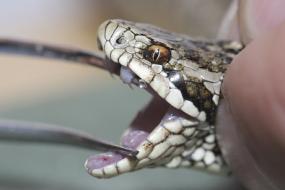 | Ebben a vipera támadásra kész tátogó feje és méregfogai nem veszélyeztetik a kutatókat. |