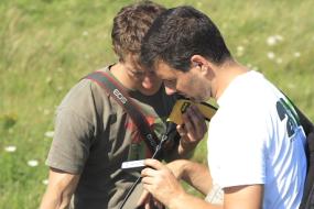 | Aztán Bálint is megérkezik - stílusosan a 2010-es európai Biodiverzitás Védelmi Év pólójában - és a mesterséges búvóüreg bejáratát árnyékoló cserép felemelésével a legvalószínűbb kígyó búvóhellyel kezd. |