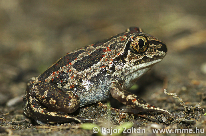 A barna ásóbéka zömök testalkatú. A fej nagy, a hátsó lábak rövidek. A dobhártya hiányzik, fültőmirigye sincs. Bőre sima, legfeljebb néhány szétszórt elhelyezkedésű szemölcs figyelhető meg rajta. A pupillarés függőleges, a szivárványhártya általában aranyszínű. A mellső végtag ujjai szabadok, a hátsó lábujjak közötti úszóhártyák jól fejlettek. A lábközépcsontok tájékán lévő dudor (belső sarokgumó) jól fejlett ásósarkantyút képez. A hímeknek nincs hanghólyagja. Színezete nagyon változatos lehet. A hímek alapszíne sárgás-, a nőstényeké inkább szürkésbarna, amelyet nagy sötét- vagy olívbarna foltok és apró vörös pontok tarkítanak. A foltok lehetnek nagyszámúak, önállóan állók, vagy hosszú sávokat alkothatnak. A hasoldal szürkésfehér, ritkán szürke foltokkal. A fiatalok kezdetben nagyon hasonlóak, az egyedi mintázottság csak fokozatosan alakul ki. Mialatt vízben tartózkodnak, a színük sötétedik, a foltok alig különülnek el. Az ivari kétalakúság kifejeződik a testméretekben: a hím teste kisebb, valamint a felkarján nászidőszakban többnyire jól fejlett ovál-mirigy helyezkedik el, amely a nászidőn kívül gyakran alig észrevehető. Tenyerén és a mellső végtagján apró dudorok alakulnak ki a nász idején. A kifejlett nőstények elérhetik a 8 centimétert. A peték 3-4 mm átmérőjűek, amelyeket több sorban, mintegy 20 mm vastag, többnyire 20-30 cm hosszú (ritkán hosszabb) zsinórban rak le a nőstény vízinövényekre tekerve. A petezsinórban akár 3500 pete is lehet. A fejlődő embriók a petezsinórban feketék. Az ebihalak keléskor 5 mm hosszúak, az átalakulásig minden más faj lárvájánál sokkal nagyobbra nőnek, meghaladhatják akár a 8-10 centiméteres hosszúságot is. Színük szürkés, barnás, néha sárgás, a hasoldal fehéres, a farok világos. A lárvák légzőnyílása baloldali, a végbélnyílás középen van. Az ebihalak farokvége kihegyezett. Az átalakult kisbékák 20-40 mm nagyok amikor a vizet elhagyják.