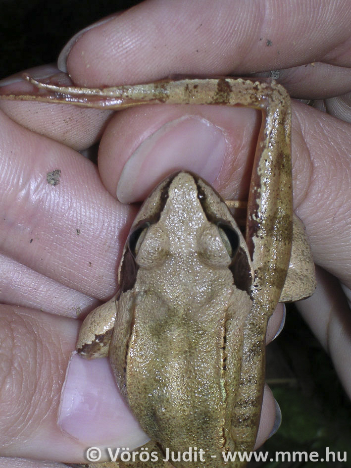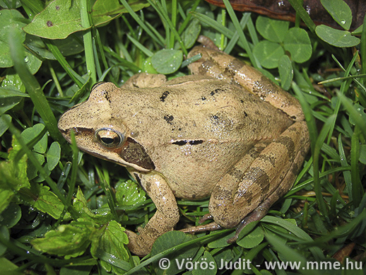 Közepes termetű, karcsú, feltűnően hosszú lábú béka. A nőstények jellemzően 6-8 (maximum 9), a hímek 5-6 (maximum 8) cm hosszúra nőnek meg. Orra sokkal hegyesebb, mint a gyepi békáé. Hosszú hátsó lábait előrehajtva a sarokízület jócskán az orr elé kerül. Nyugalmi pózban hátsó lábainak sarokízületei a test mögött sokszor összeérnek, igen jellegzetes körvonalakat kölcsönözve az állatnak. Hátának színe világosbarna vagy drapp, rajta előfordulhatnak kisebb sötét foltok vagy márványozás, ez azonban sohasem jelentős. Legkontrasztosabb rajzolata a sötét kantár- és halántéksáv, ez rejti a dobhártyát, mely a gyepi békáénál kisebb, és közelebb helyezkedik el a szemhez. Hátsó lábain többnyire jól kivehető a kb. 10 sötét keresztsáv. Hasoldala fehéres, néha kissé rózsaszínes vagy sárgás beütéssel, a gyepi békával szemben egyszínű. A hát és a has színe között fokozatos az átmenet, az oldalakra szintén a szürkésbarnás, esetleg halványsárgás árnyalatok jellemzők. Tavasszal a hímek hüvelykvánkosa világos, a test színéhez hasonló árnyalatú, állaga gumiszerűen ruganyos. Ebihalaik farokzászlója magas, sokszor a hát hátsó kétharmadánál kezdődik, jellemzően kontrasztosan, sötéten foltozott. Az ebihalak ezenkívül magasabb, robusztus testükkel, aránylag rövidebb farkukkal különíthetők el a rokon fajok lárváitól.