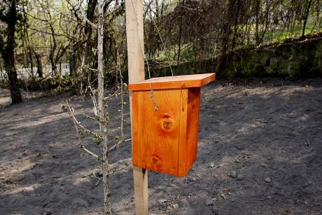 | A széncinegék és verebek B, valamint a seregélyek D típusú odúit elegendő fejmagasságba kihelyezni. A kép jobb oldalán természetvédelmi farakás és süntanya látható. |